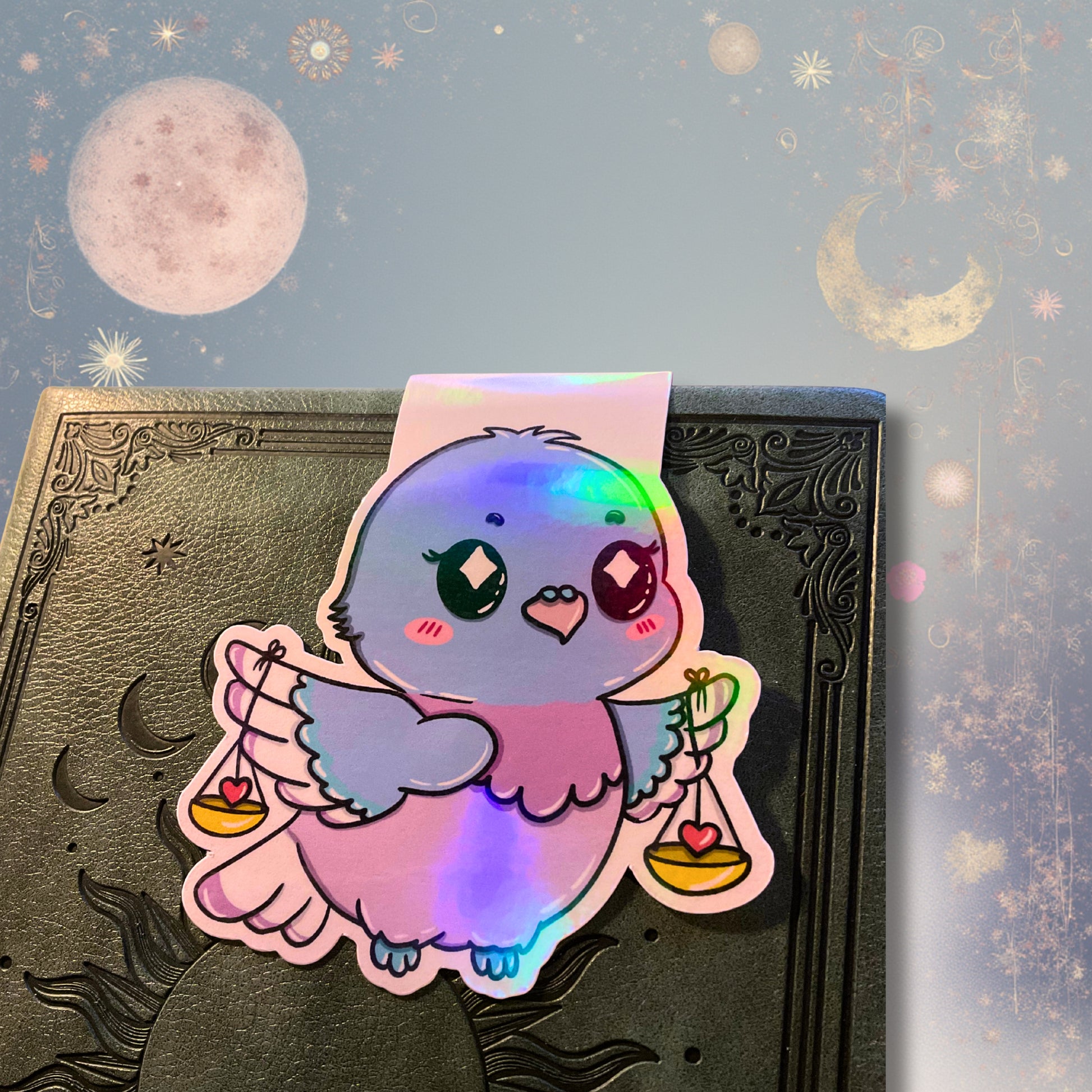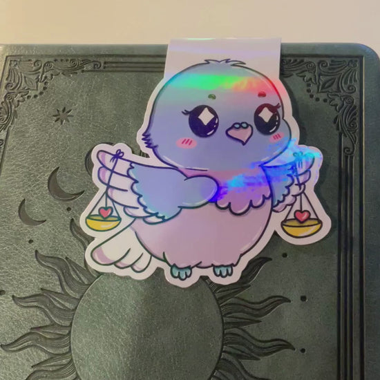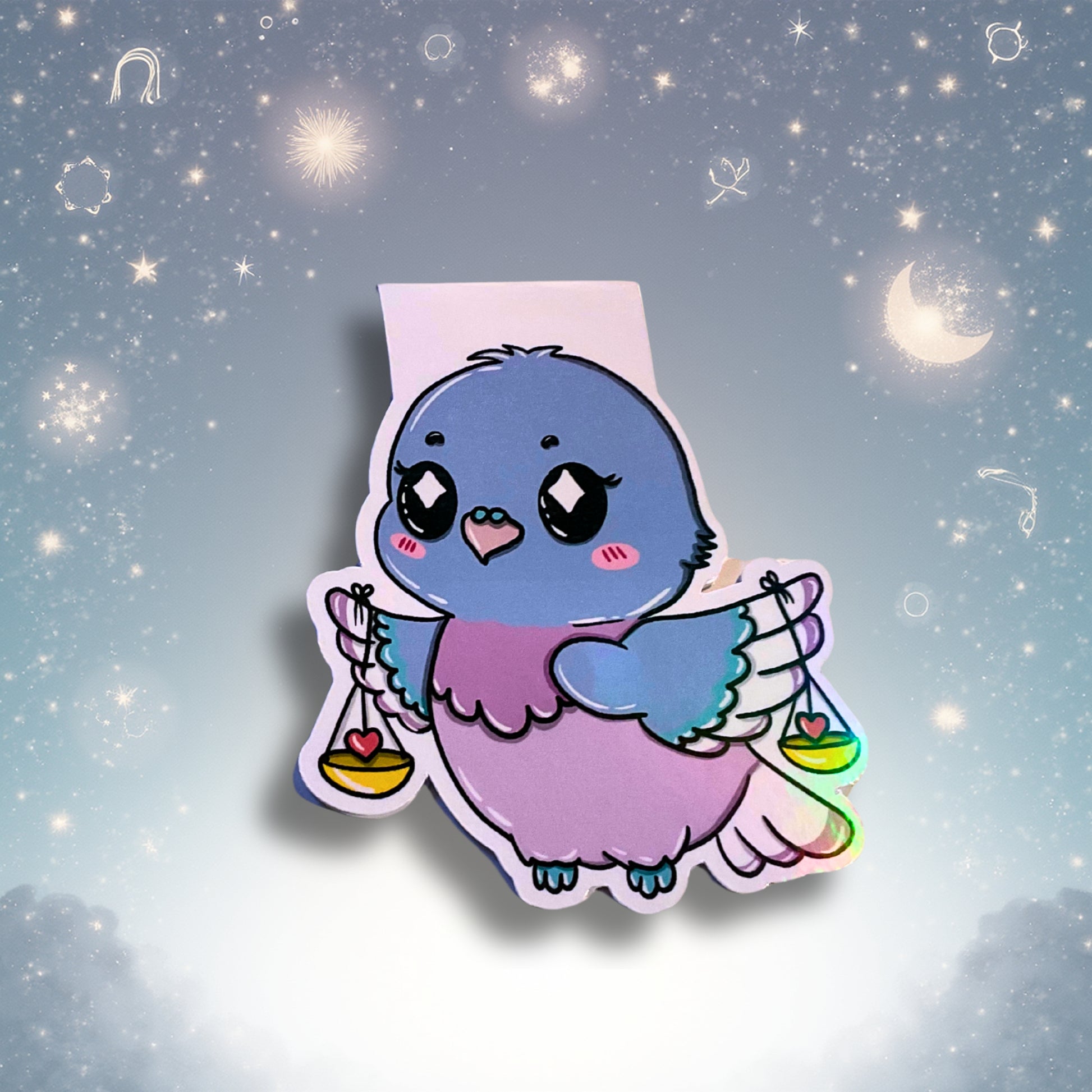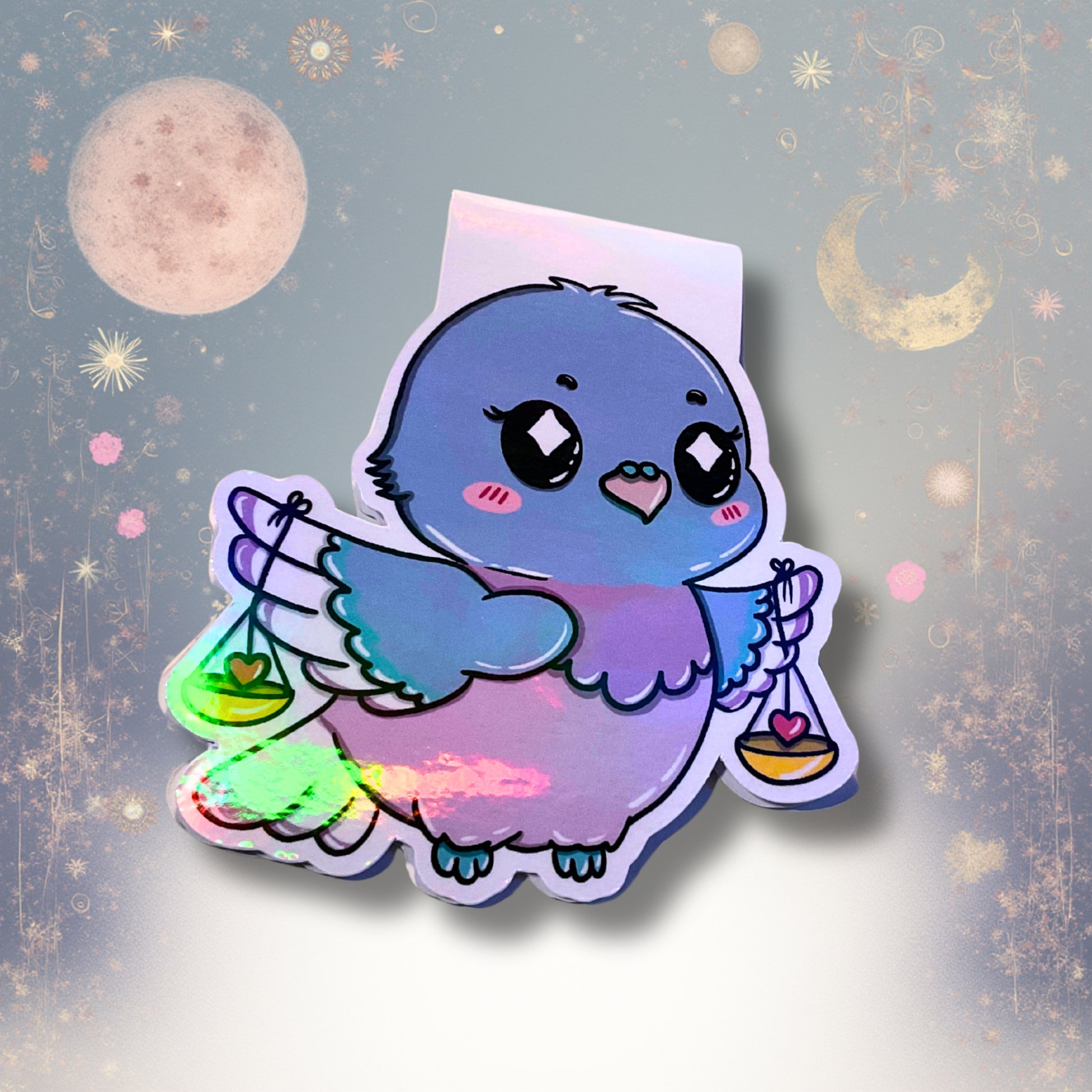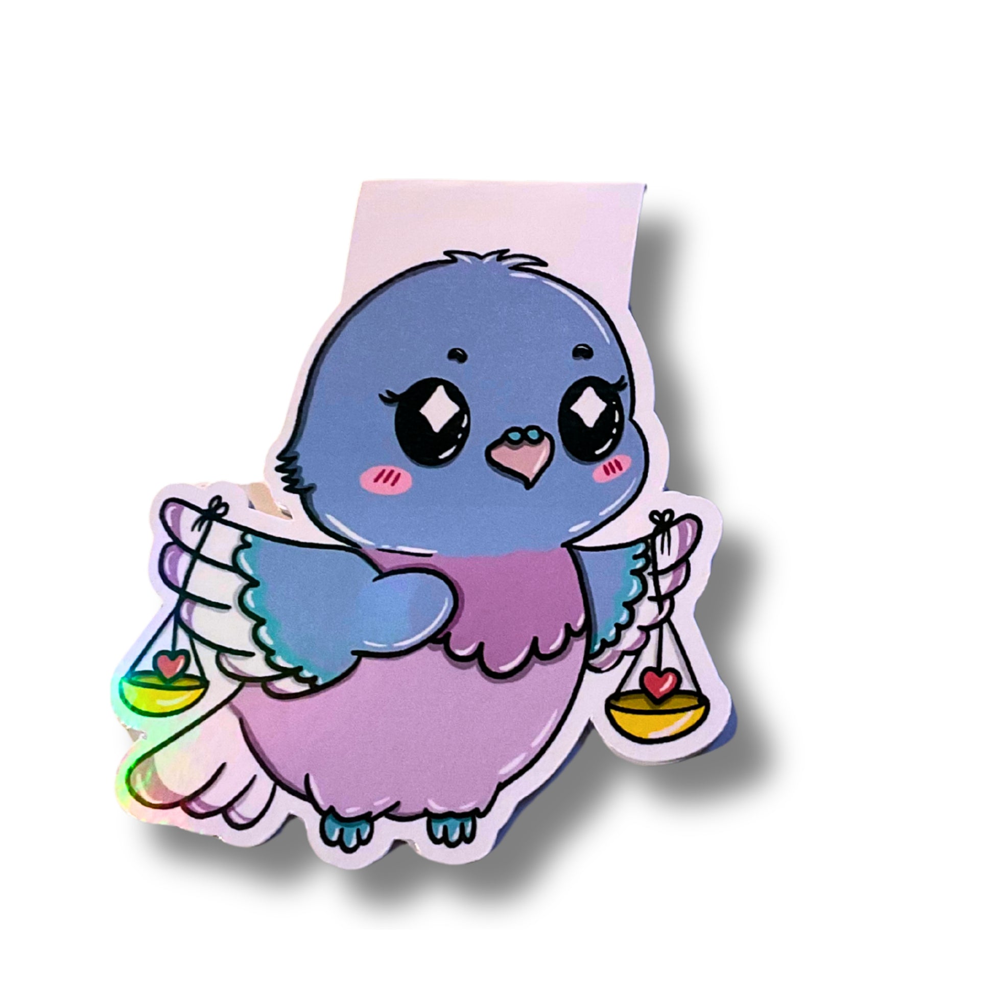 Harmonisch, feinfühlig und friedvoll – die kleine Taube trägt an ihren Flügeln zwei Waagschalen, in denen Herzen schaukeln. Ein Symbol für Ausgleich, Liebe und Leichtigkeit beim Lesen.